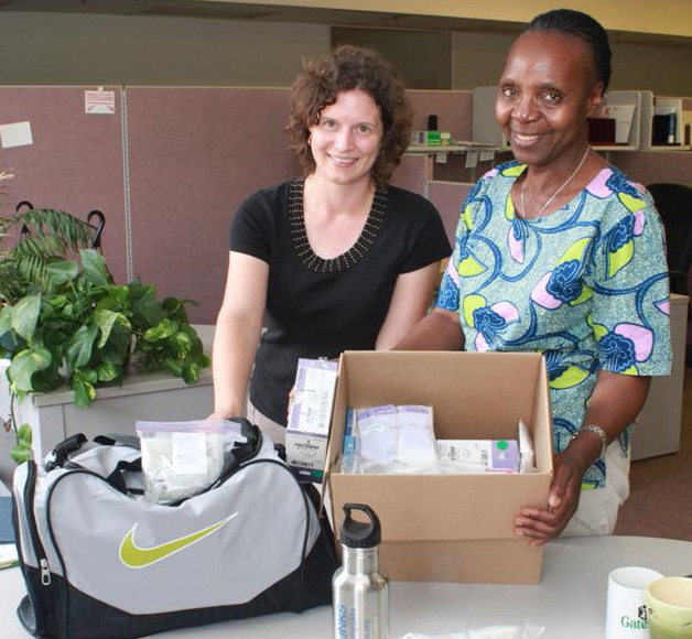 - Dr. Musariri with Jennifer Novelli, director of the suture program at Global Links, showing suture and midwife packets donated by Global Links for St. Albert’s.