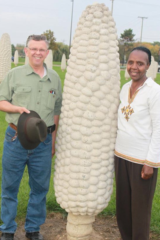 - Dr. Julia Musariri and Darrell Ward, of Better Healthcare for Africa, with maize sculpture at Sam & Eulalia Frantz Park, Dublin, Ohio.